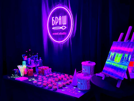 Naše neon art radionice su centralni deo Brush Event Studio ponude. Radionice su namenjene odraslima, deci (7+) uz pratnju roditelja, kao i zatvorenim grupama.